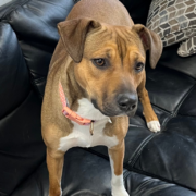 Eleven-month-old Penny’s classic Boxer-mix coat and intelligent eyes are the color of a newly minted, uncirculated Penny. It’s a color that won’t be seen nearly as often now that the coins are going away. They weren’t valuable enough to survive. Penny, who’s spayed and has perfect manners, hopes that someone recognizes her value.