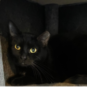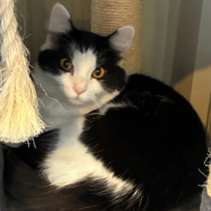 No artist but Mother Nature could have created something as exquisite as the 11-month-old, tuxedo-wearing Thelma Lou. The spayed, vaccinated, little lady has a perfectly marked, pink-nosed, white face, with huge golden eyes. Those eyes gaze out of the midnight-shaded part of Thelma Lou’s face. White ears, unusual on a tuxedo cat, make Thelma Lou even more interesting.