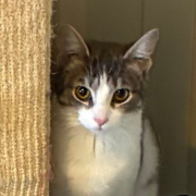 Andi, a young, white cat with tabby decorations, is the shelter’s most social cat. The director says, “She’s a hoot, all about people and being in your personal space.” Andi, who’s spayed, is as much a companion animal, a best friend as any puppy.