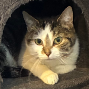 Other cats in the Shelter’s cat room, a large room where cats move freely, showing people their real personalities, know that Cat Cat is a mellow soul. The one-year-old, spayed cat is also a bit shy. Even sweet, social cats are overwhelmed by the unfathomable changes in their world.
