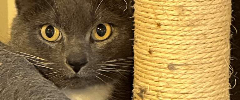 However, for now, Dude is hiding in the cat tree in the corner. All he can think about is going home.