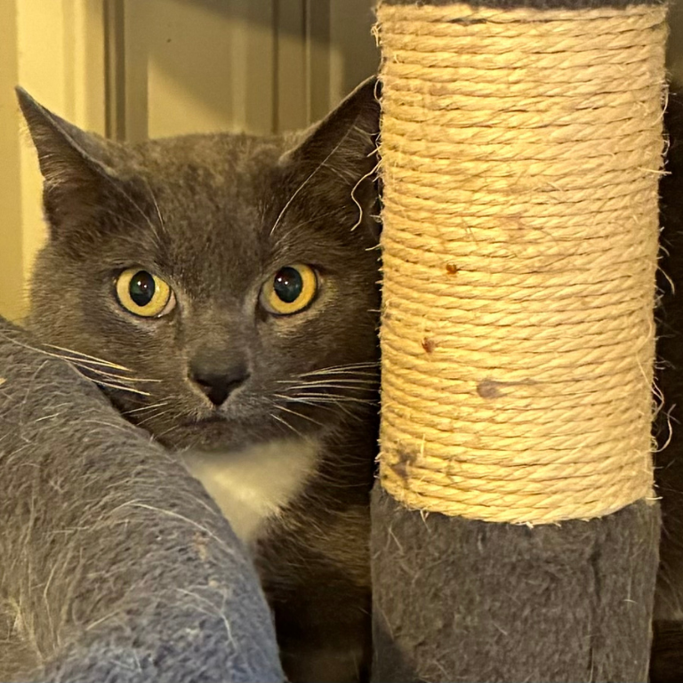 However, for now, Dude is hiding in the cat tree in the corner. All he can think about is going home.