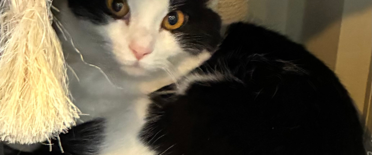 No artist but Mother Nature could have created something as exquisite as the 11-month-old, tuxedo-wearing Thelma Lou. The spayed, vaccinated, little lady has a perfectly marked, pink-nosed, white face, with huge golden eyes. Those eyes gaze out of the midnight-shaded part of Thelma Lou’s face. White ears, unusual on a tuxedo cat, make Thelma Lou even more interesting.