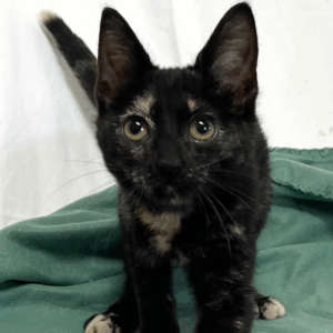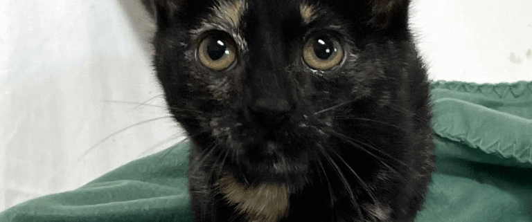 Kittens show when they, once-upon-a-time, were loved. Tawny’s way of approaching people, ready to share a cuddle, ready to play, shows that she lived with people. Yet, now, when she’s just four months old, those people are through with her. The beautifully marked tortoiseshell kitten was wandering alone, gazing at strangers, pleading for help.
